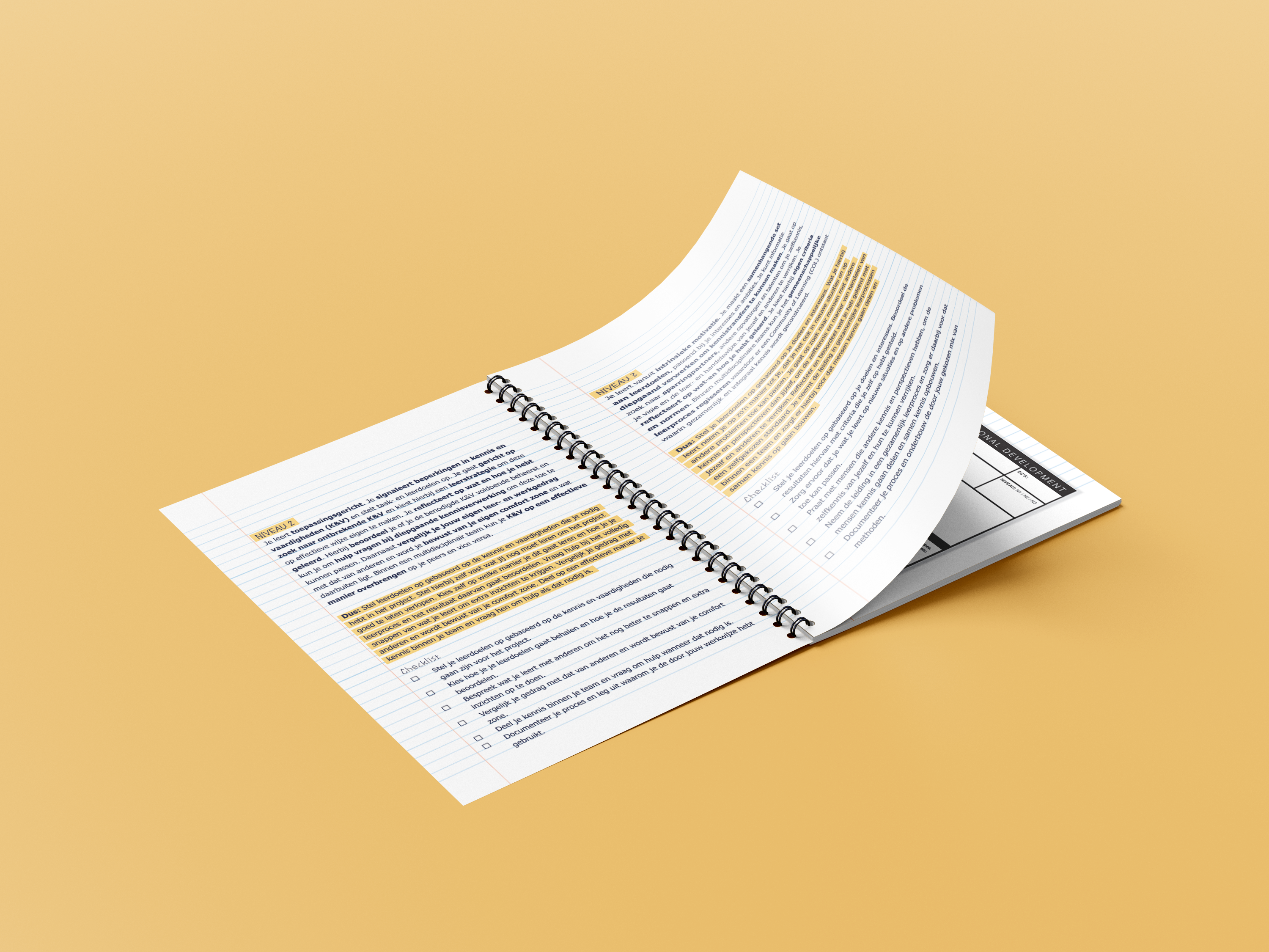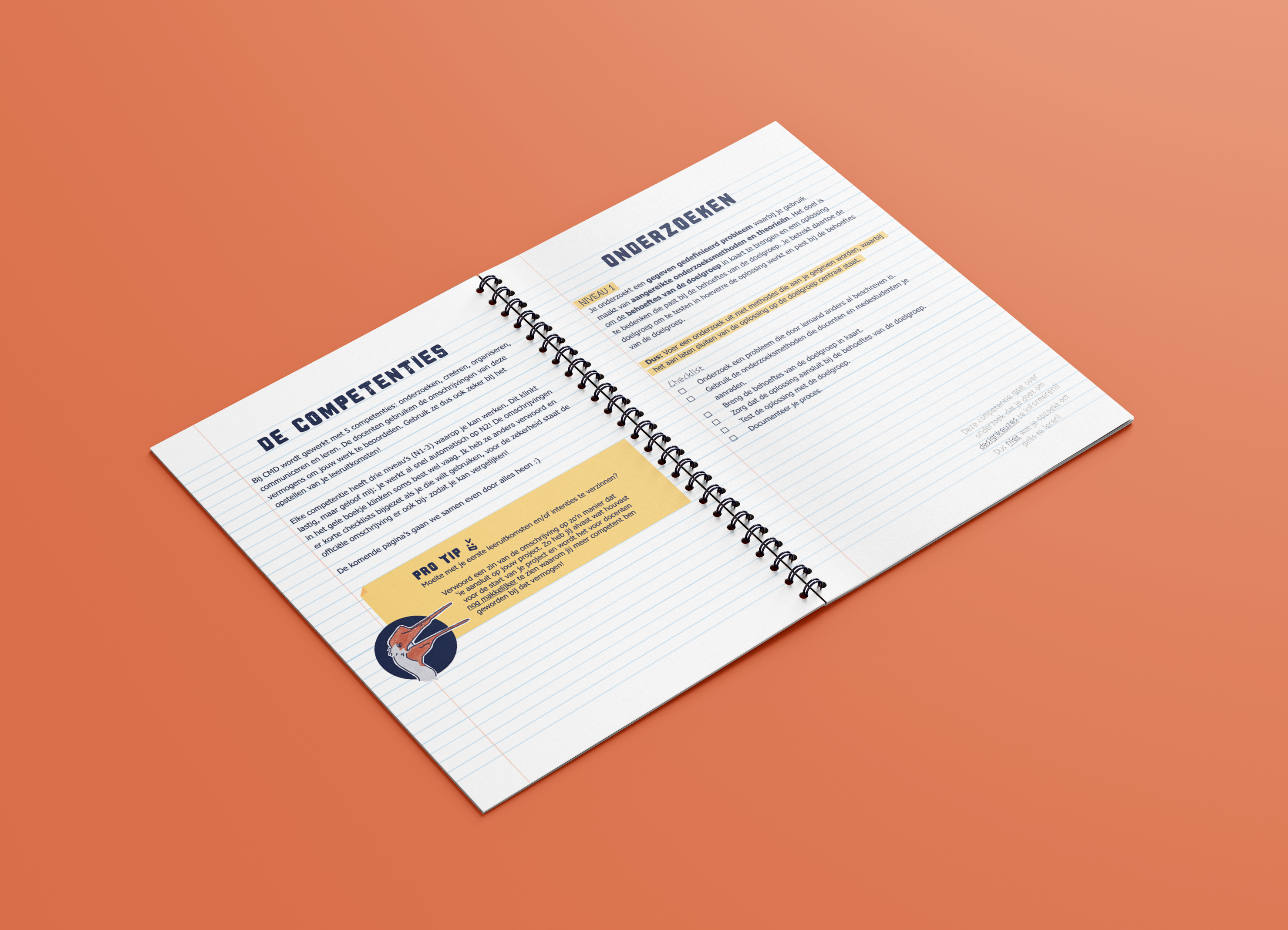 Op CMD bestaat een geel boekje, hierin staan alle competenties omschreven. Deze kunnen studenten gebruiken om in te schatten wat en hoeveel ze moeten doen om punten te halen en op welk niveau. Uit eindelijk leveren studenten dan hun uitgevoerde werk in met een groeiportfolio.