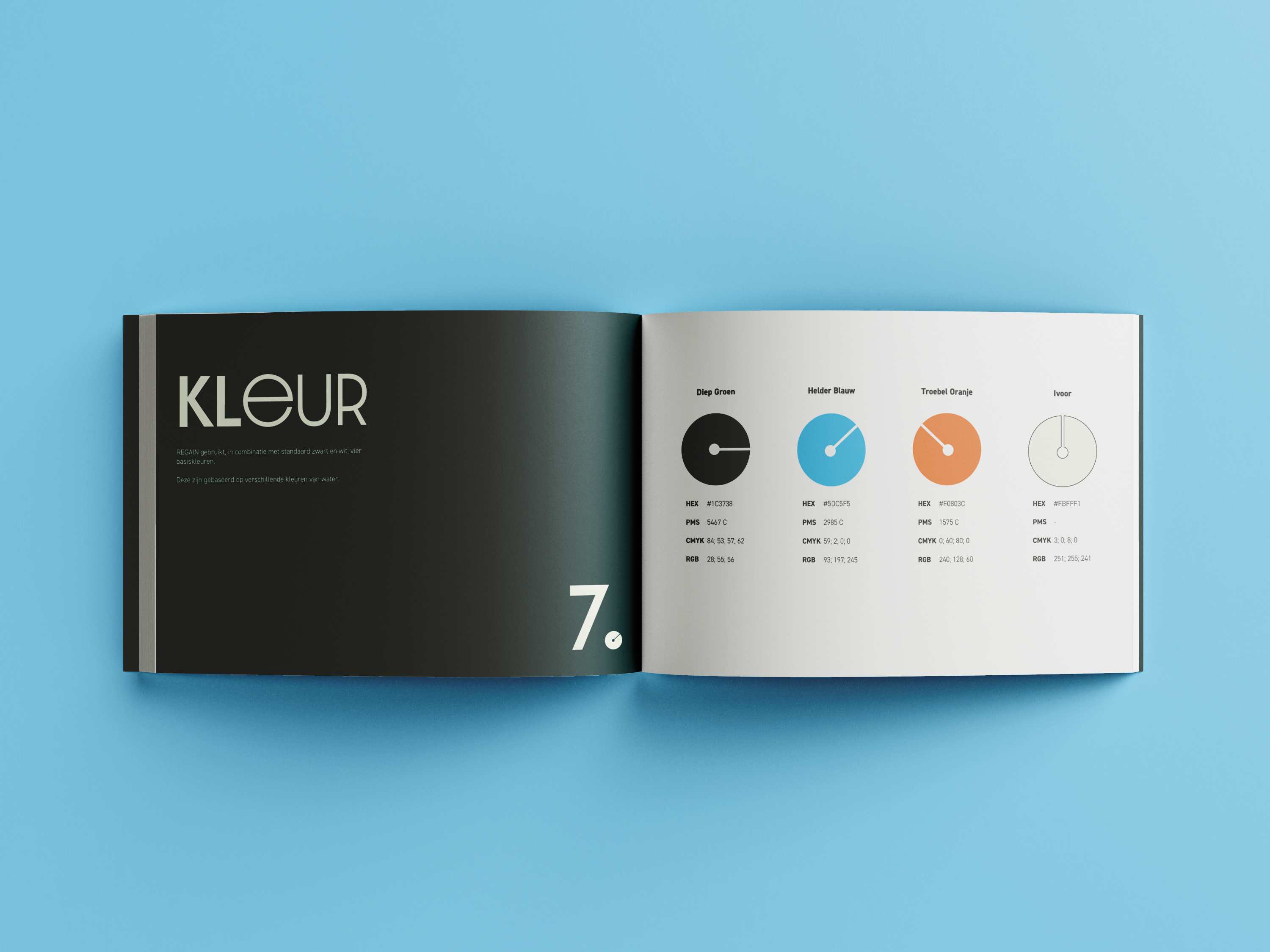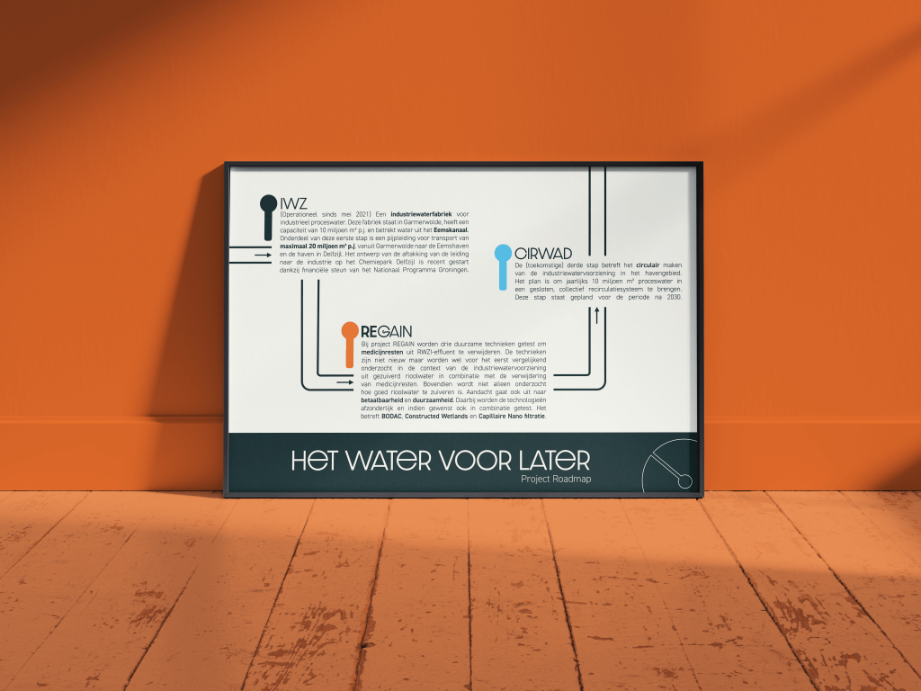 Het idee voor de huisstijl was een uitstraling die professioneel, maar niet te serieus is. Iets wat aansluit bij hoe de watertechnologie bedrijven zich graag presenteren, maar wel aantrekkelijk is voor studenten en helpt REGAIN er uit te springen op open dagen en informatiemomenten.